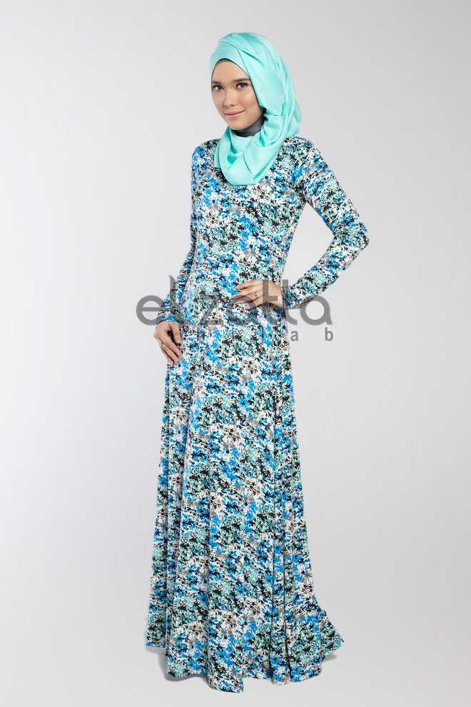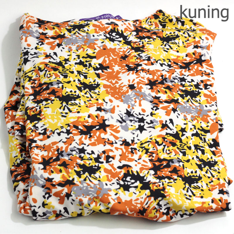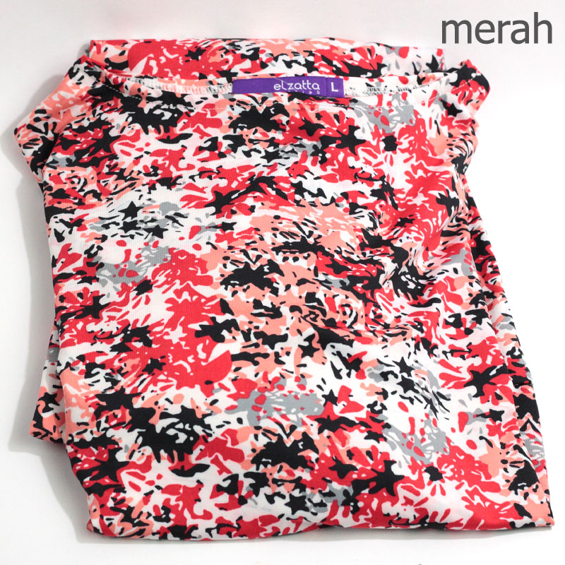 Gamis Elzatta bermotif abstrak dari bahan spandex.