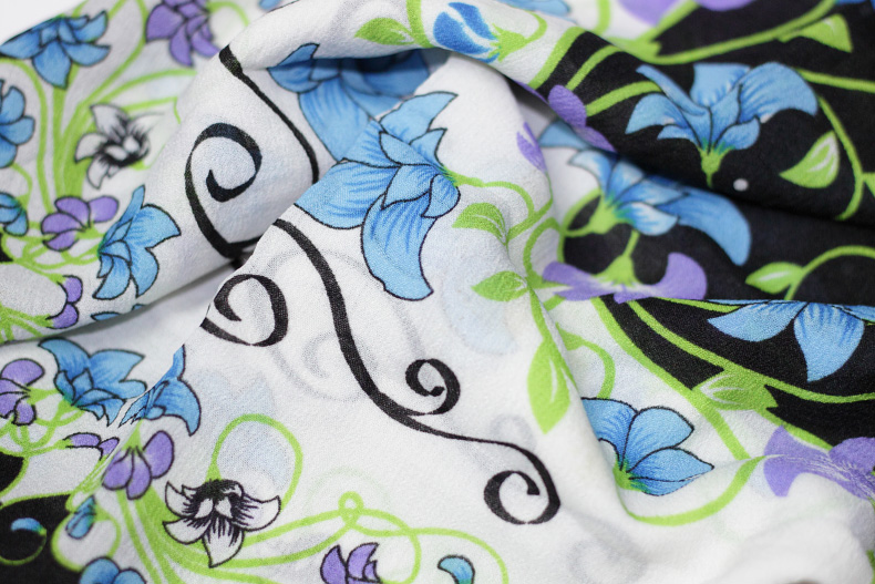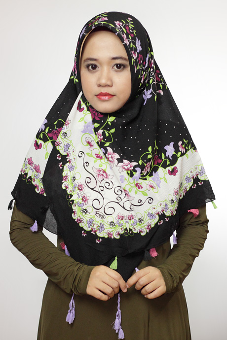 Description : Kerudung segiempat bermotif bunga dengan detail rumbai pada tepinya.